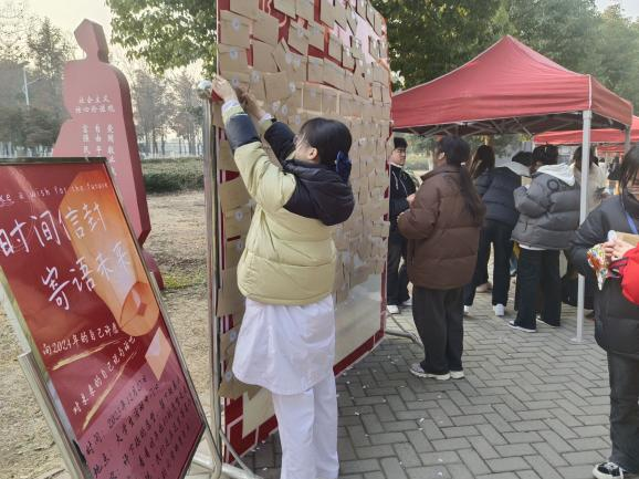 校学生会还为大家精心准备了“时间信封 寄语未来”的环节。同学们在明信片上写下新年愿望,塞进信封,贴在心愿墙上。校学生会将大家的信封统一保管,等待来年验证心愿。