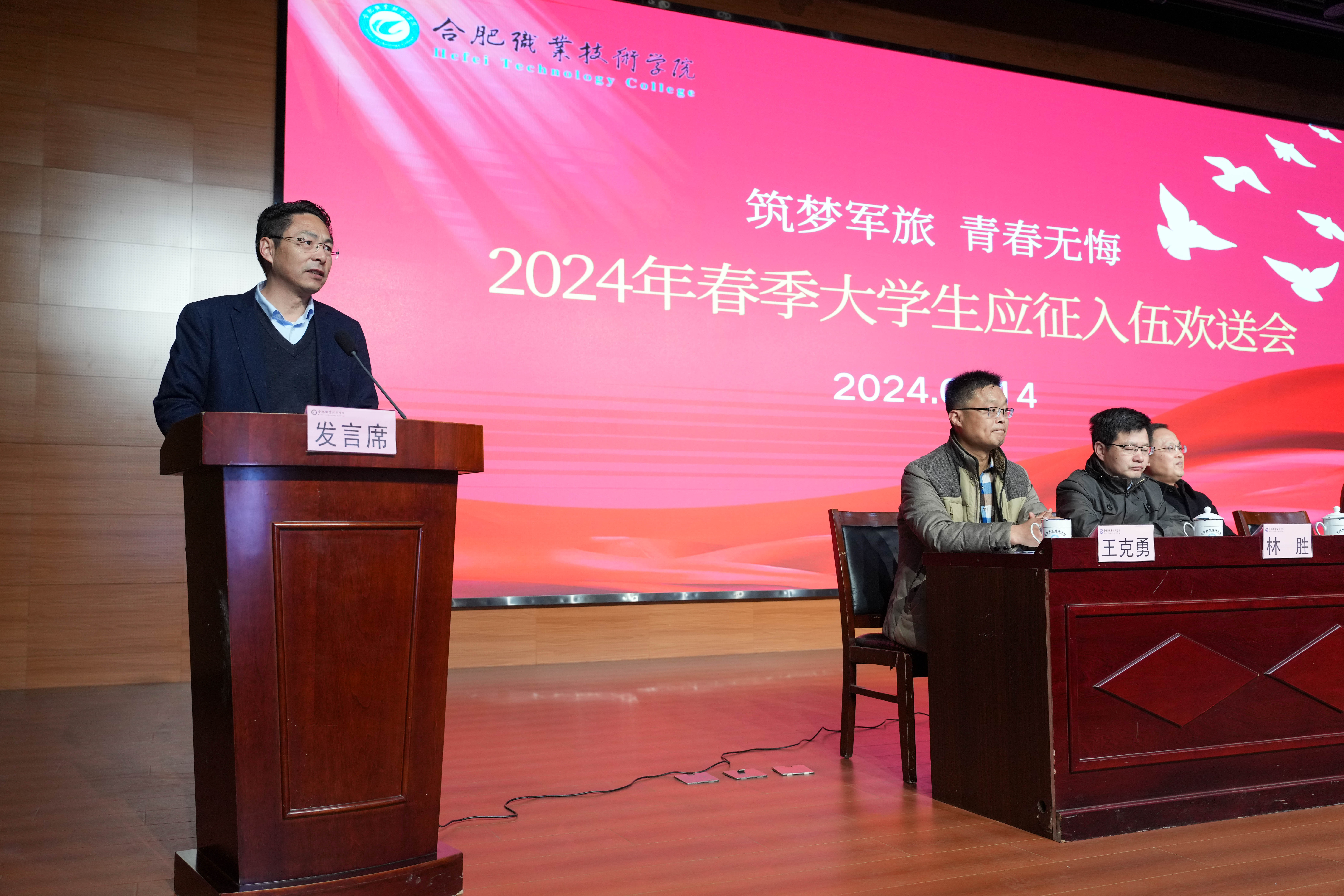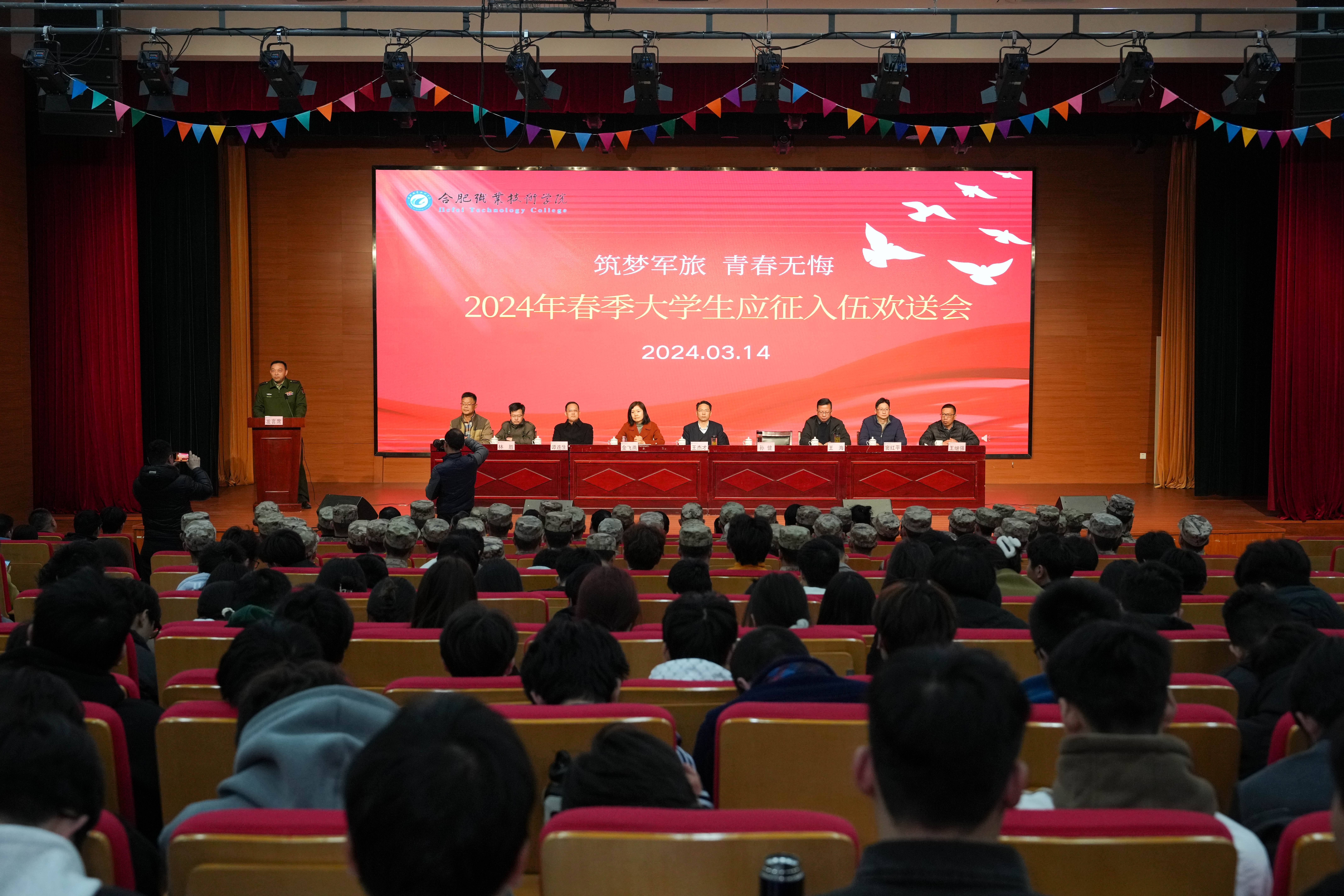 3月14日上午,我校在巢湖校区大学生活动中心礼堂举办“筑梦军旅 青春无悔”2024年春季新兵入伍欢送会。校党委书记王杰才出席会议并讲话,巢湖市委常委、人武部部长孙健应邀出席,会议由校党委副书记金飞燕主持。
