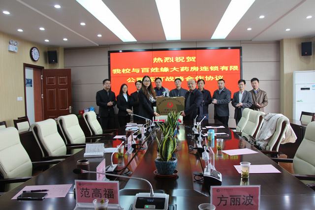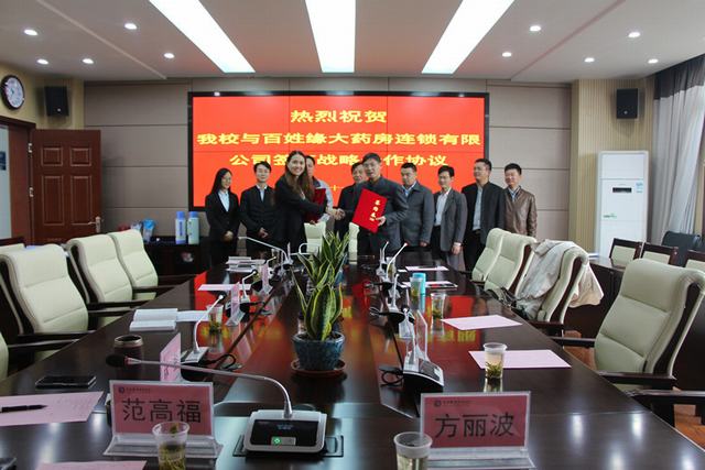 11月16日,安徽百姓缘大药房连锁有限公司行政总监洪兰以及该公司人力资源部、培训部、拓展部负责人一行来我校签订“店长储备人才班”和校内“实体药房”合作战略协议。副校长周晓隆及生物工程学院相关负责人出席签约仪式。签约仪式由生物工程学院党总支书记宁业群主持。