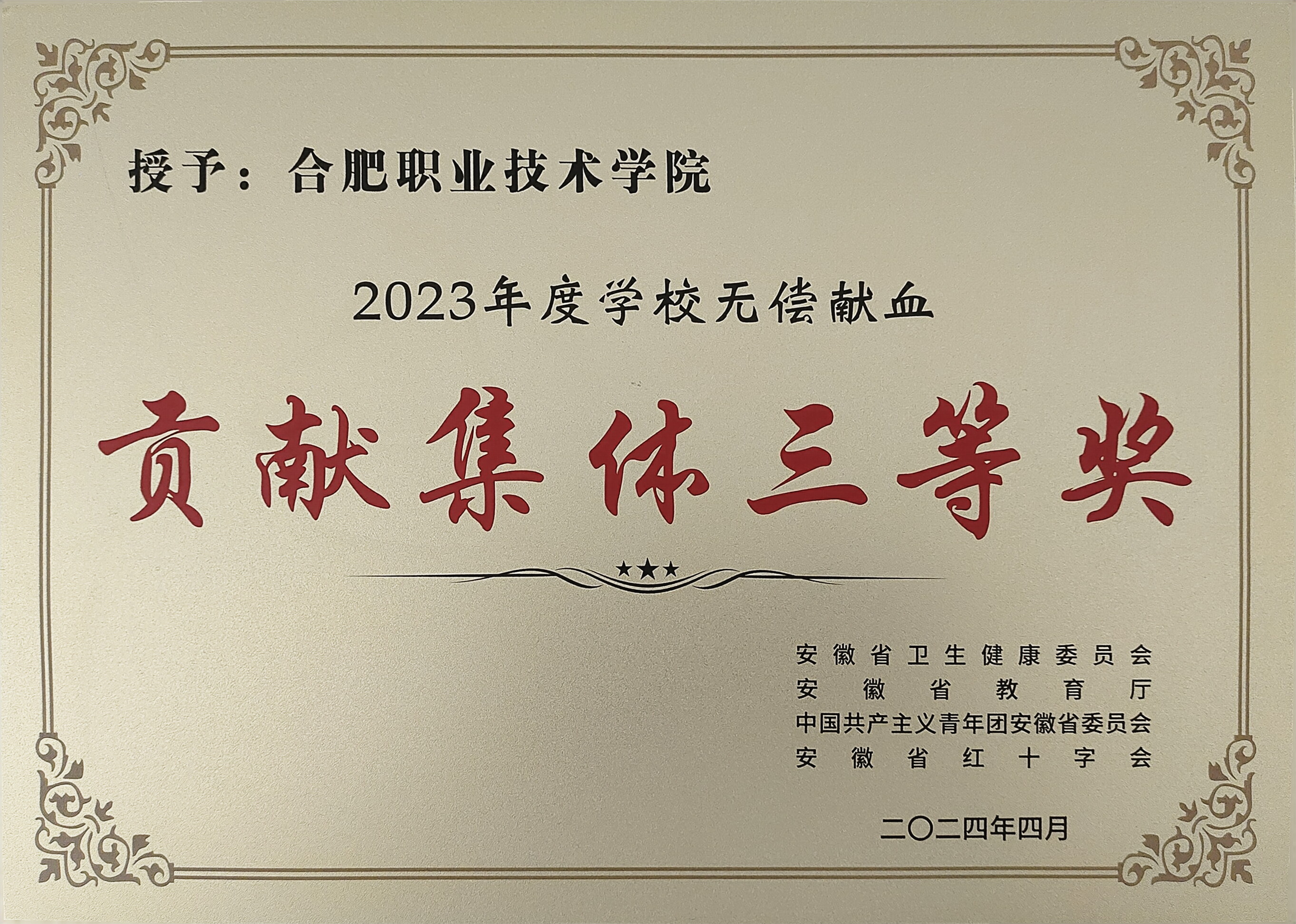 4月26日,由省卫健委、省教育厅、团省委、省红十字会、省输血协会指导,合肥市卫健委、市红十字会主办的2023年度驻肥高校无偿献血工作总结表彰暨2024年启动会顺利举行,我校获2023年度学校无偿献血“贡献集体三等奖”,青年志愿者联合会陈万粟同学被评为2023年度学校无偿献血“优秀组织个人”。