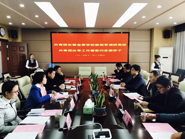 11月24日,团省委学校部部长邹永生到我校调研指导高校共青团改革工作,并慰问我校机电工程学院贫困学生琚健伟。团省委学校部主任科员王磊、团市委学校部部长李锐、池州市贵池区办公室主任周永飞等同志陪同,校党委副书记胡其云,团委、学生处、机电工程学院相关人员接待邹永生一行。