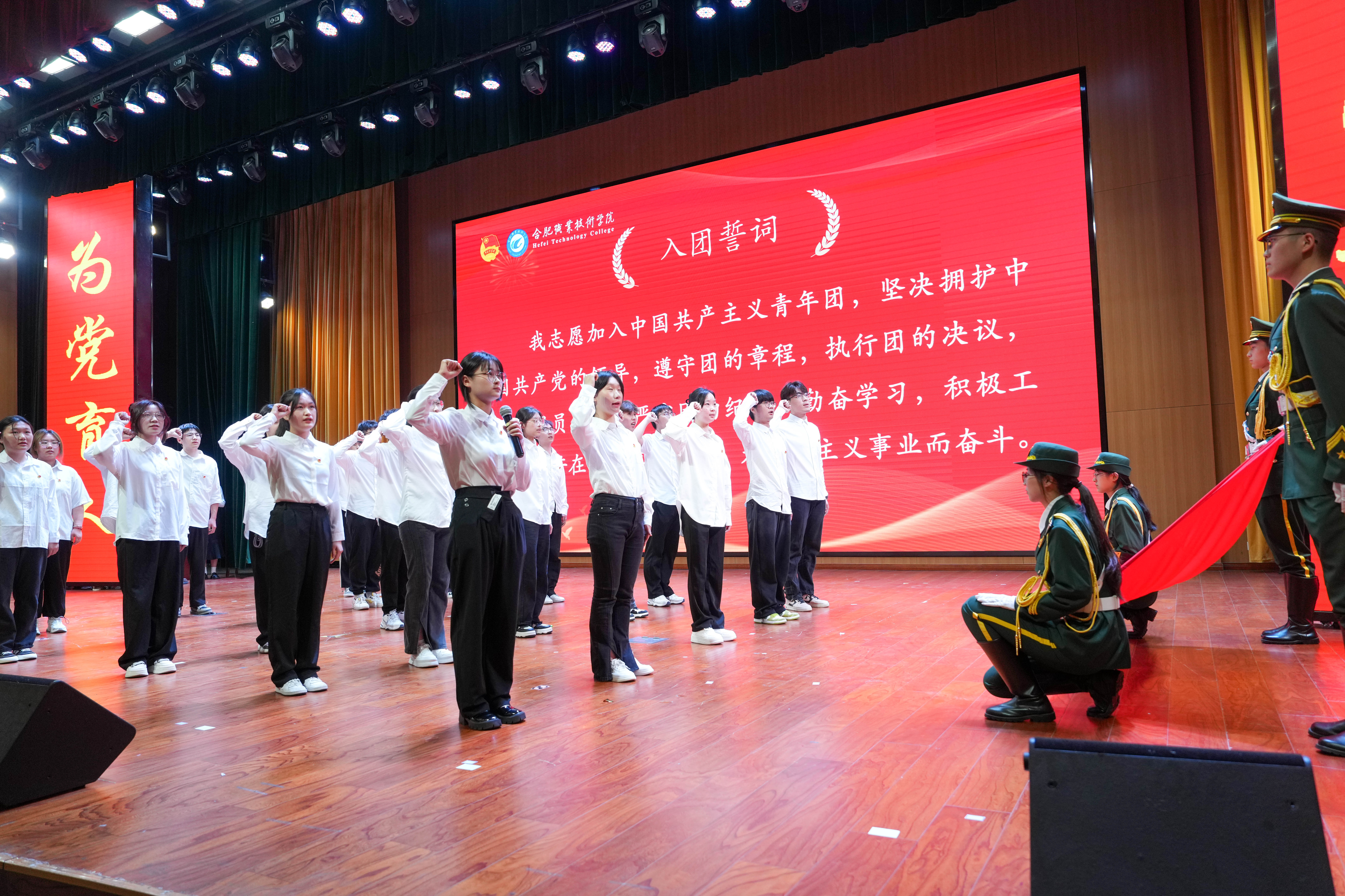 随后进行的是新团员入团教育仪式。各二级学院团总支书记为新团员们佩戴团徽,2024年度新发展团员以最洪亮的声音和最饱满的精神状态面对鲜艳的团旗进行宣誓。一面团旗就是一种信仰,一枚团徽就是一份力量。新团员们将继承和发扬五四精神,牢记誓词,坚定不移听党话、跟党走,为共产主义事业而奋斗。