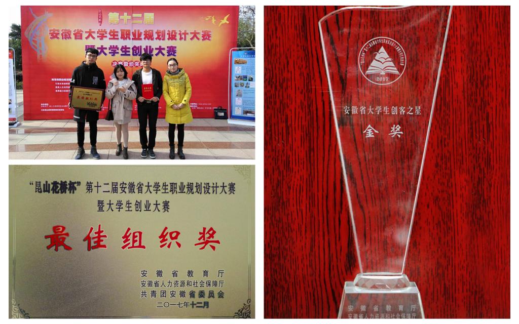 本次大赛历经校赛、省半决赛和全省总决赛三个阶段,共有54所高校的40名选手晋级参加总决赛。我校经过前期各二级学院的广泛动员和积极参与,校赛中各组选手结合自身的兴趣爱好、所学专业等设立合理的职业目标,体现出对未来职业生涯的美好憧憬和创业目标的精心谋划。经过初赛、复赛的层层选拔,就业组和创业组各一组选手进入省半决赛。在参赛过程中,我们坚持学校组织与企业支持相结合、二级学院组队指导与学校职能部门做好服务相结合、以及相关学院师生跨专业优势互补相结合的指导思想,经过大家的团结合作,最终由李翀怡(医学院)、李兆峰(信息与电商传媒学院)、葛至涵(医学院)三位同学组成的创业团队,凭借科学的规划、自信的展示、生动的讲解、机敏的回答感染了在场的观众,在高手云集的平台上展示了我校学子的综合素养和精神风采,以优异的表现荣获创业组金奖。