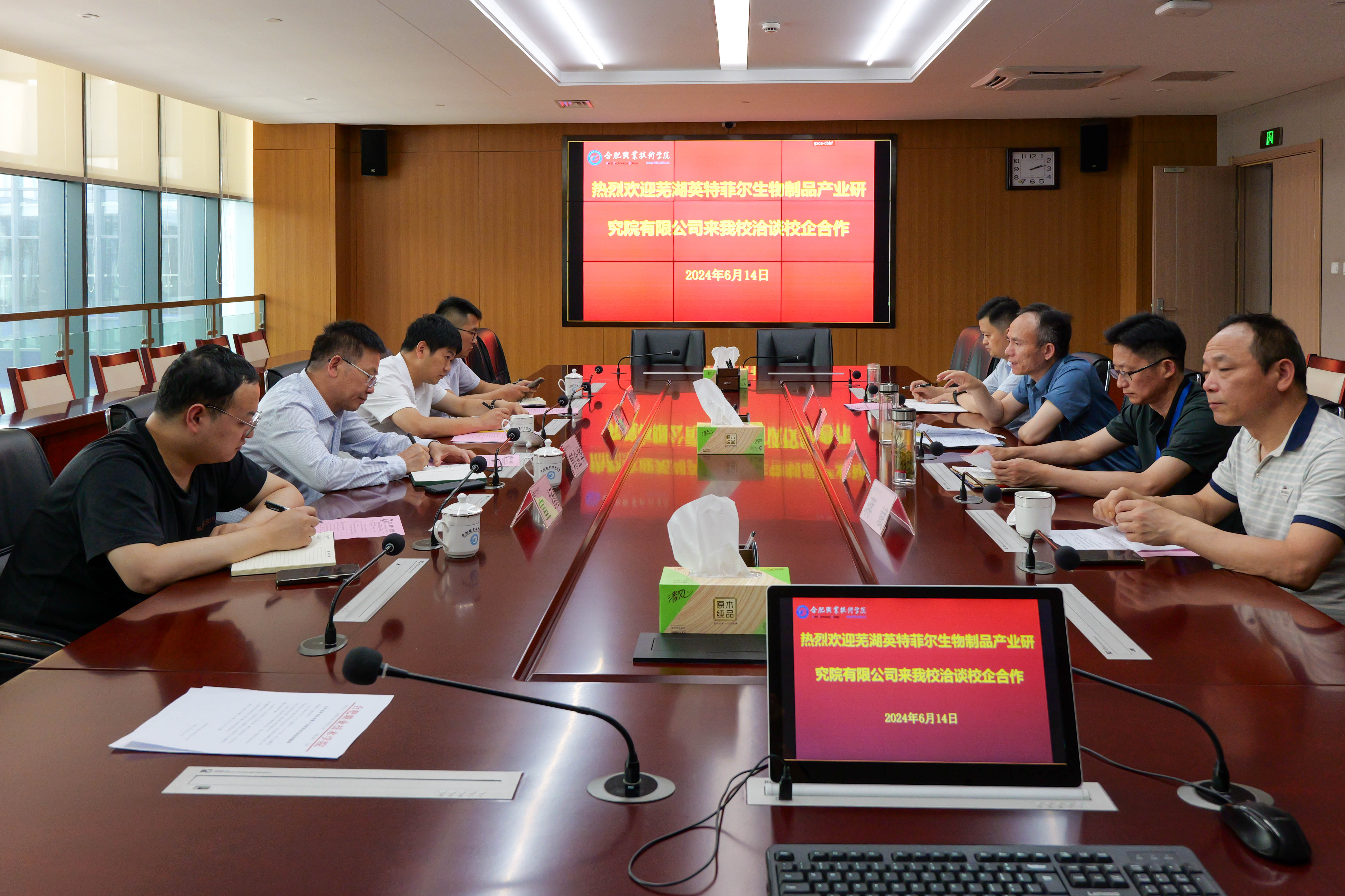 6月14日下午,芜湖英特菲尔生物制品产业研究院有限公司董事长赵俊博士,公司首席科学家郭金华教授等一行4人来校洽谈校企合作。校党委副书记、校长檀明,教务处、科技处、医学院等部门负责人参与了洽谈。会议由檀明教授主持。