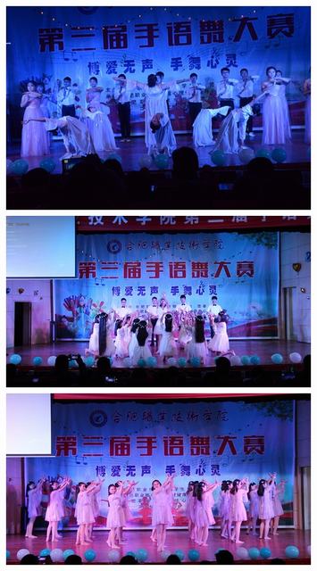 温馨的音乐,灵动的手语,璀璨的舞台,热情的观众,合职学子集聚一堂。来自六个二级学院共计12支参赛队伍的表演精彩纷呈,尽显风采。灯光下的舞者用手之舞,表心之语,轻柔的指尖,舞动出爱的奇迹,带给观众视觉的享受与心灵的感动。动感振奋的《我相信,年轻的战场》,古韵大气的《国家》,阵容庞大,动作整齐划一,点燃了在场每一个人的热情。天使般真情演绎的《遇见》、轻扬曼舞的《没什么不同》用无声的手语划出了唯美,深深感染了在场的每一位观众。《父亲》静默不语,却爱的深沉;《时间都去哪儿了》匆匆然,那份爱,已经嵌在内心最深处。同学们用真情演绎出了“亲情”,那份最特别的疼爱,是时光沉淀的恩典。《我们的故事》用不同情景演绎了我们青春、烦恼、奋进……别出心裁的队形转换,细腻流畅的动作展示,舞蹈与手语巧妙结合,勾勒出一幅幅动人的画面,手语之美,尽显其中。