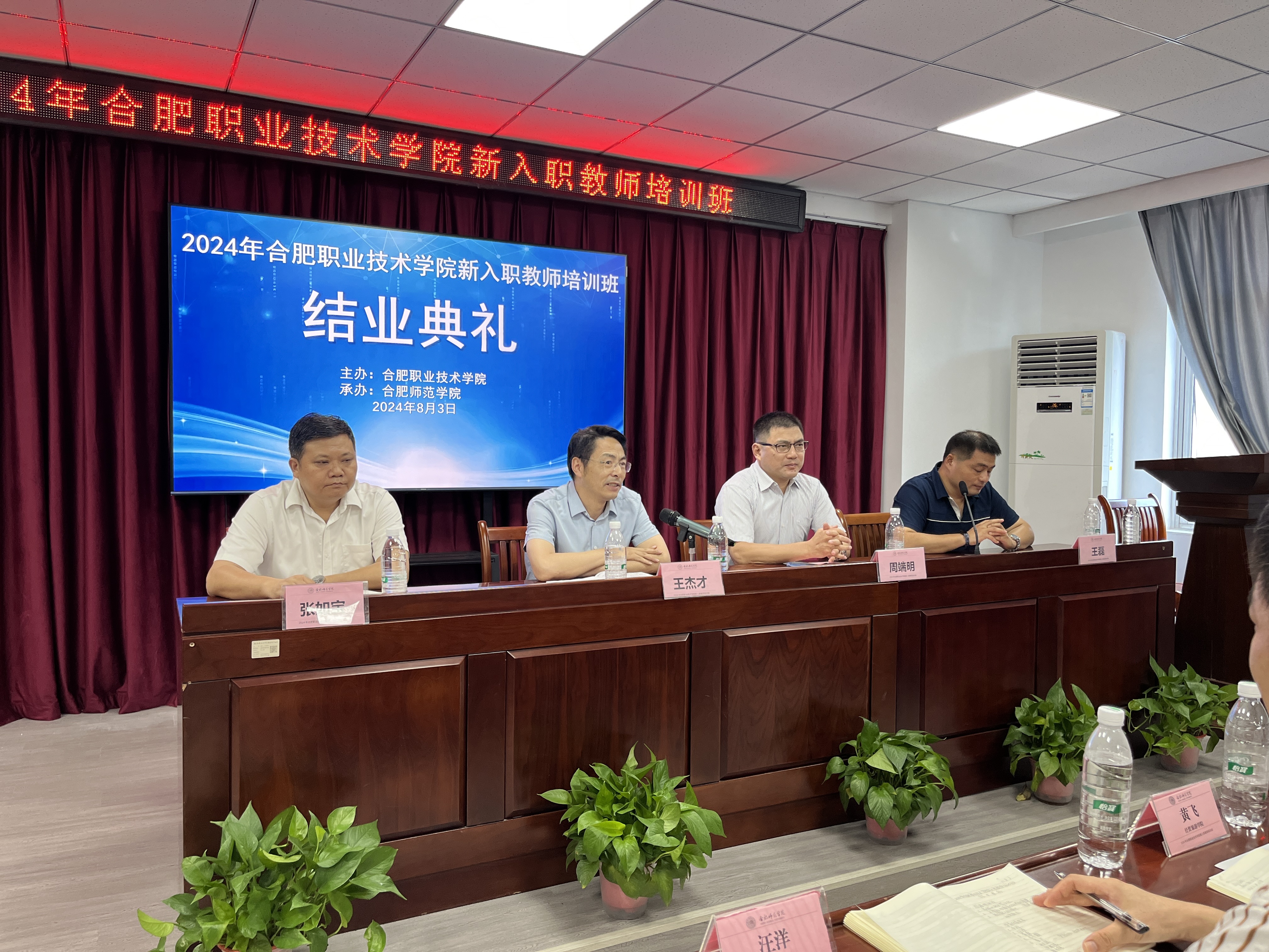 8月3日下午,我校2024年度新入职教师教学能力提升培训班结业典礼在合肥师范学院三孝口校区举行。此次结业典礼标志着为期二十一天的2024年度新入职教师教学能力提升培训班圆满结束,合肥师范学院党委委员、副校长周端明,我校党委书记王杰才,党委委员、组织人事部部长张如宝,合肥师范学院继续教育学院副院长王磊等领导出席结业典礼。此次培训委托合肥师范学院承办,培训对象为第二批近5年入职的非师范专业毕业新教师,全校共85名教师参加此次培训。