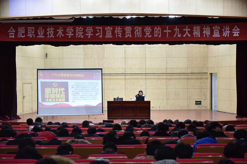 为认真学习、深入领会、大力宣传、全面贯彻党的十九大精神,我校组织成立了以校党委分管负责人为团长,部分职能负责人及思政部骨干教师为团员的学校党委十九大精神宣讲团,利用课余时间,在大学生活动中心二楼礼堂及图书馆二楼报告厅面向学生进行十九大精神的广泛宣讲。此次系列宣讲活动从2017年12月4日起持续至2018年元月2日,共十五场,实现了在校学生学习十九大精神全覆盖。
