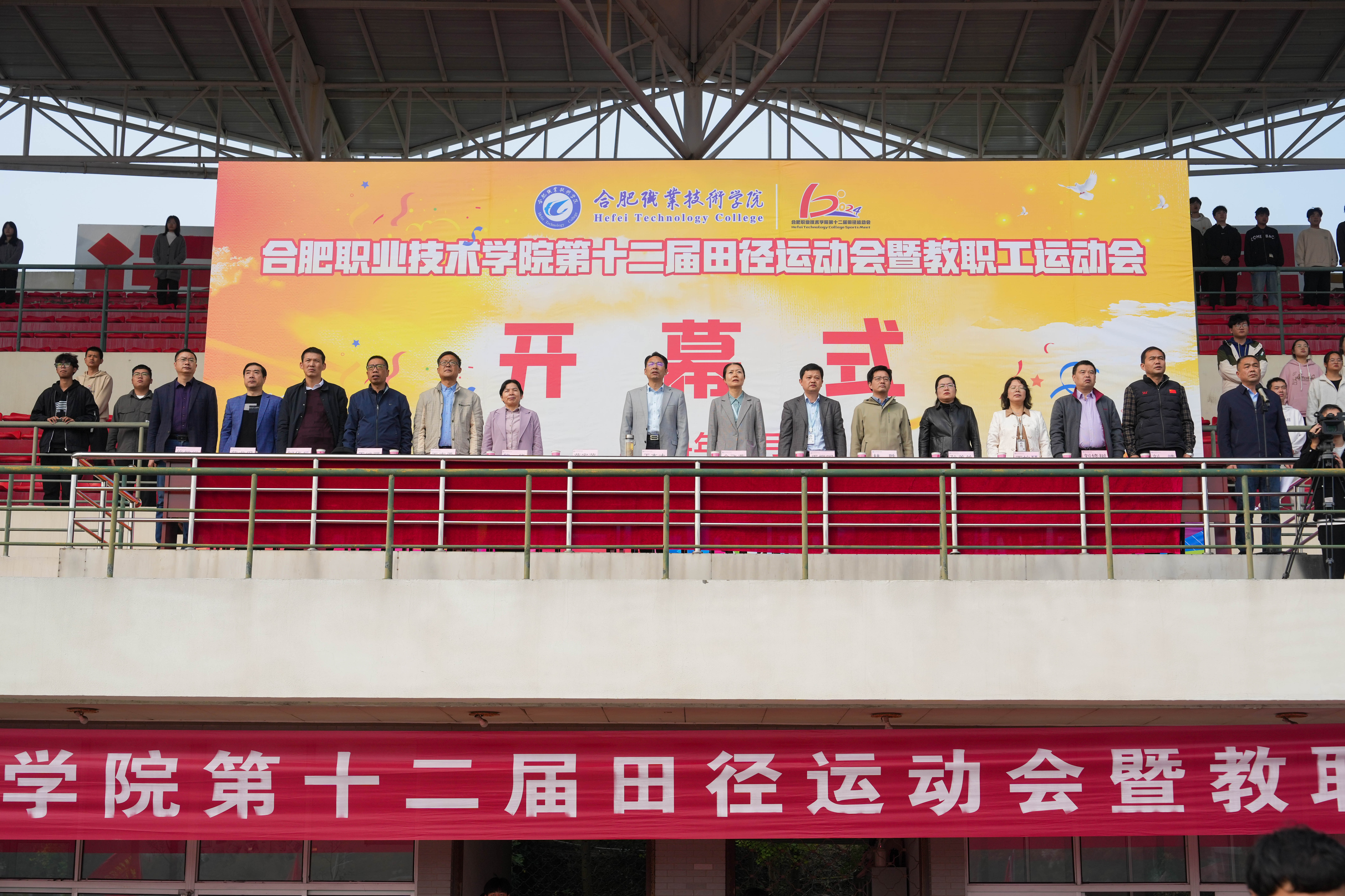 开幕式伊始,在激昂的乐曲声中,国旗护卫队迈着坚定的步伐,护卫着国旗、校旗、本届运动会会旗庄严入场。紧接着,由鼓山校区各二级学院、校学生会带来了情景剧+舞蹈等节目表演,现场一片欢腾,欢呼和掌声阵阵。随后,各二级学院运动员方队和裁判员方队依次入场,各方队着装整齐,喊着洪亮的口号,充分展现出合职师生团结协作、奋发开拓的精神面貌。入场式结束后,随着国歌声响起,鲜艳的五星红旗冉冉升起,全体师生肃立,齐声高唱,歌声高亢,响彻校园。