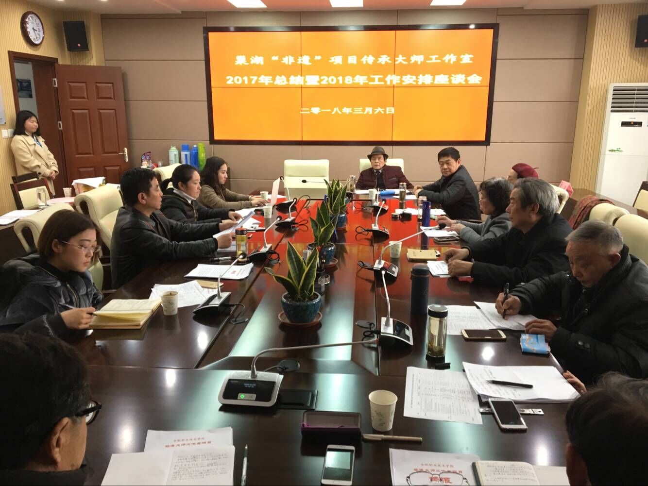 3月6日下午,我校巢湖非物质文化遗产项目传承大师工作室2017工作总结暨2018工作安排座谈会在学校行政楼3楼会议室召开。校党委副书记胡其云、巢湖民歌国家级传承人李家莲老师、“有巢氏”文化研究创始人宁业高研究员、巢湖市人大科教文卫工委会主任缪建华、巢湖民歌会会长蔡善康以及项目组校内外成员共同参加会议。