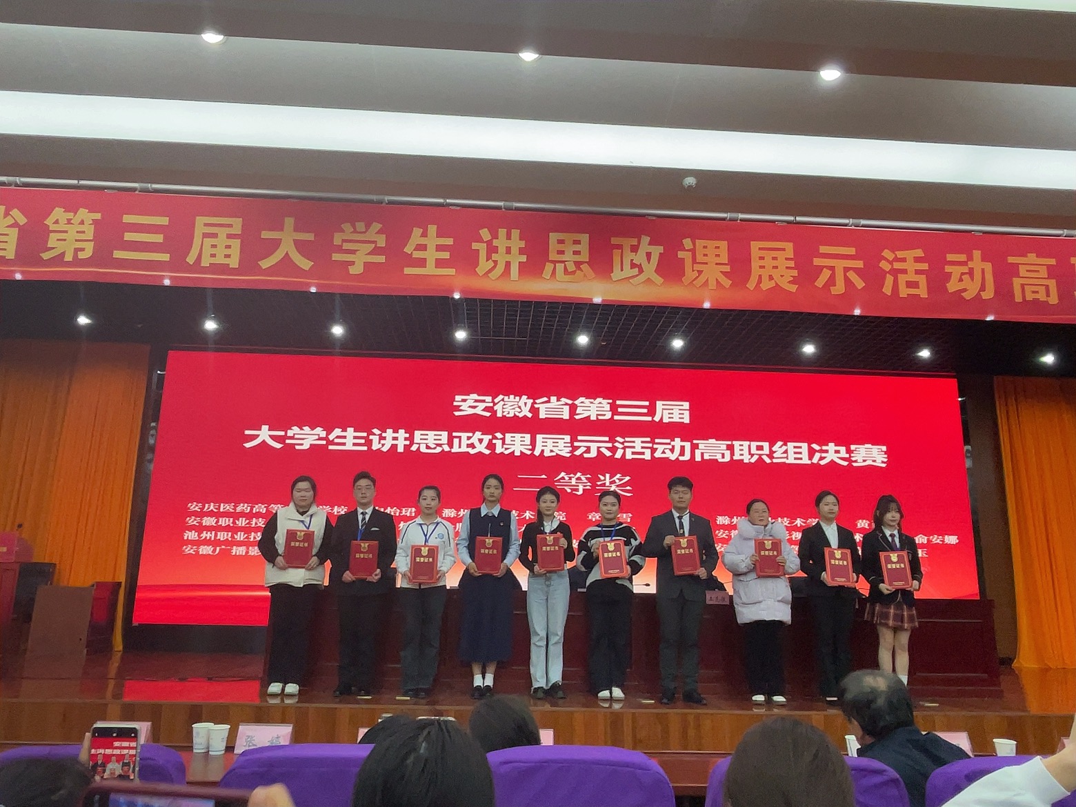 安徽省决赛中斩获佳绩。决赛共有来自全省21所高职院校的32支高职队伍进入决赛,我校共2组作品冲进决赛。选手们围绕《习近平新时代中国特色社会主义思想概论》《毛泽东思想和中国特色社会主义理论体系概论》《思想道德与法治》《形势与政策》四门课程中的有关章节或专题进行现场展示。严谨的教学设计、丰富的教学内容和精彩的现场展示,呈现了一堂堂精彩纷呈的思政课,赛出了选手们的水平和风采。经过激烈的现场角逐,我校斩获特等奖1名、二等奖1名的优异成绩。