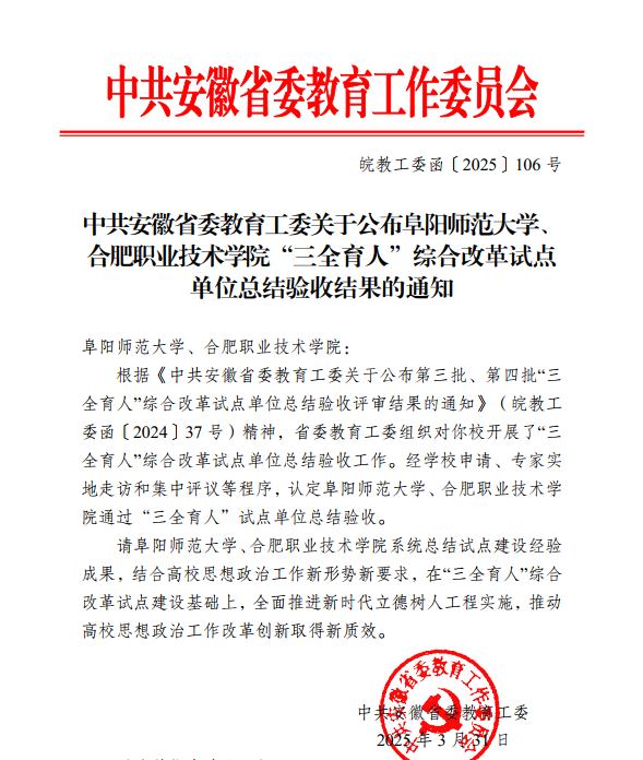 2019年底,我校入选安徽省第三批“三全育人”综合改革试点学校培育单位名单。2024年12月,验收考核专家组来到我校,通过听取汇报、实地考察、材料评审、现场问询等方式,对学校“三全育人”工作进行全面考核,并对我校育人工作的创新性与实效性给予高度评价。