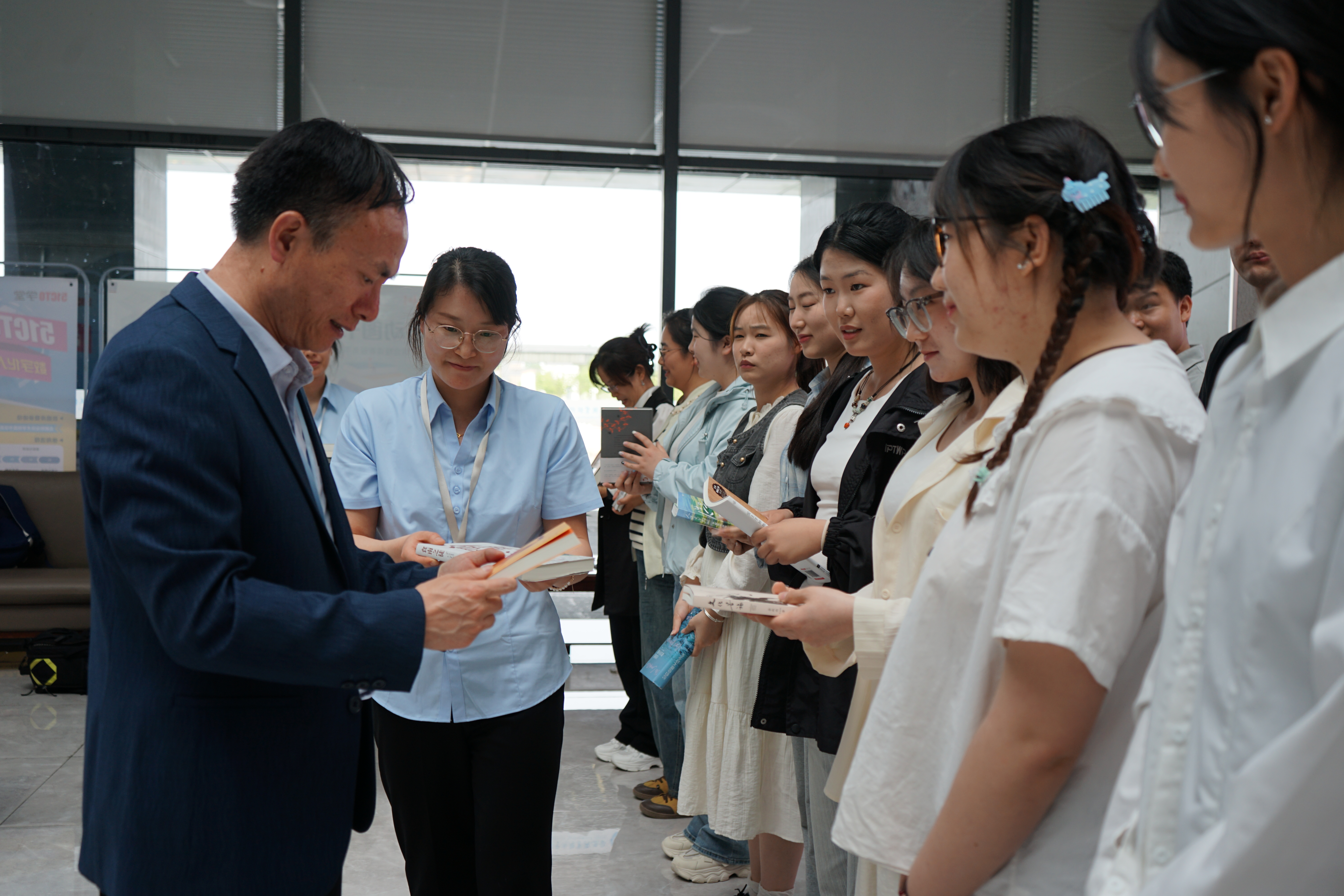 分享会分为四个环节。师生代表发言环节中,5名学生与3名青年教师依次分享推荐书目的感悟与实践启示,语言精炼、观点鲜明,带我们遨游于法律、教育、科技与心灵的广袤天地;互动交流环节中,10名学生代表积极提问、畅谈心得,现场思维碰撞热烈。檀明对师生们能积极阅读和思考给予了表扬,指出美好的青春时光需要书籍的陪伴和滋养,学校给师生们创造了良好的读书环境,鼓励青年教师和同学们不负韶华,多读书读好书,通过阅读遇见更好的自己,并分享了个人阅读经历,提出“精读与泛读结合”“培养批判性思维”等实用建议,推荐了《毛泽东选集》《物种起源》《数字化生存》等涵盖人文、自然、科技等领域的经典书籍,引发师生共鸣。活动尾声,大家合影留念,校长向师生代表赠送签名书籍套装,为活动画上温暖句点。