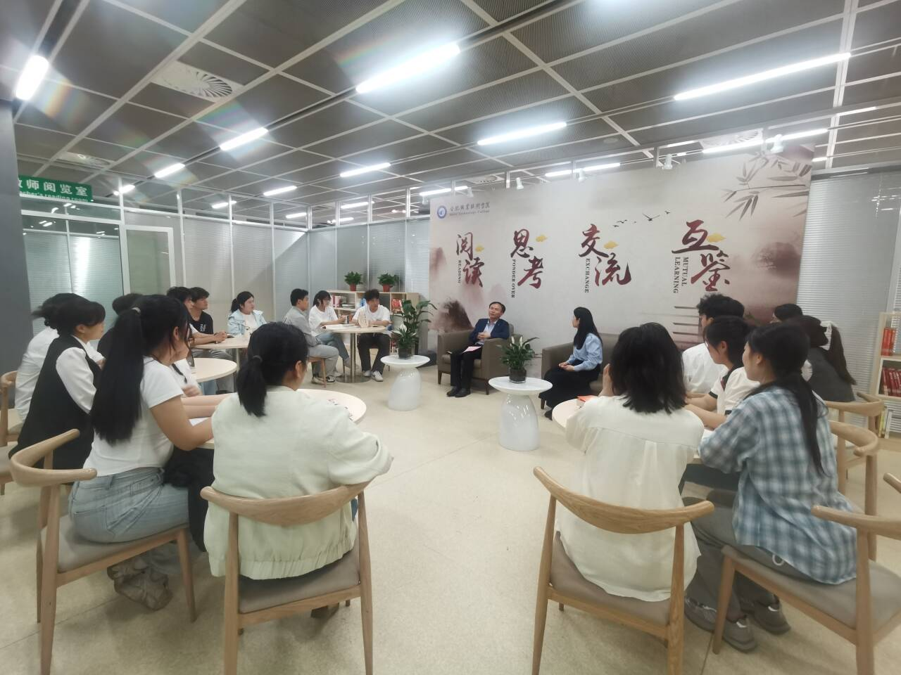 4月23日世界读书日当天,我校在汇心湖校区图书馆四楼教师研修室举办了主题为“书香润心田 对话启未来”的校长读书分享会。校党委副书记、校长檀明和教师、学生代表齐聚一堂,通过多元互动共话阅读力量,深化校园文化内涵。校党委副书记金飞燕参加。