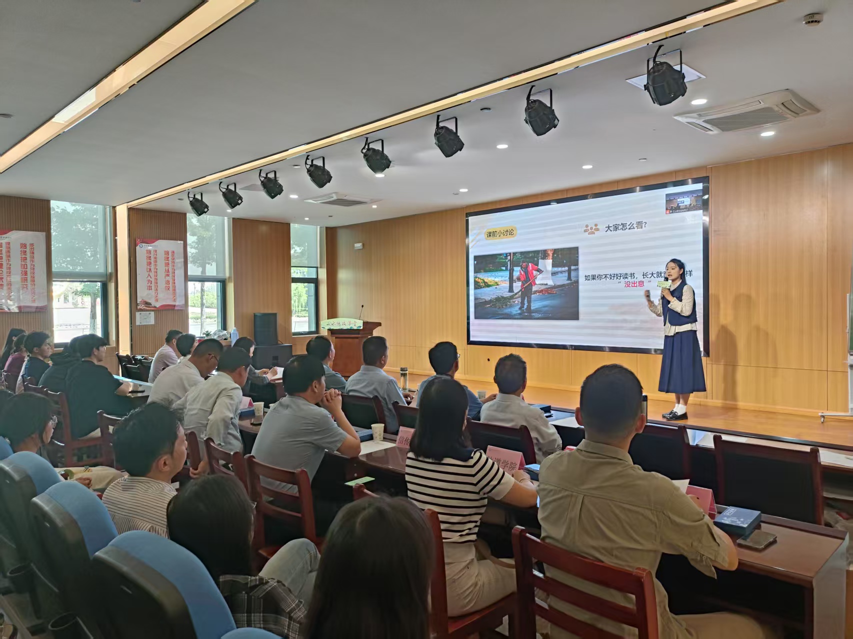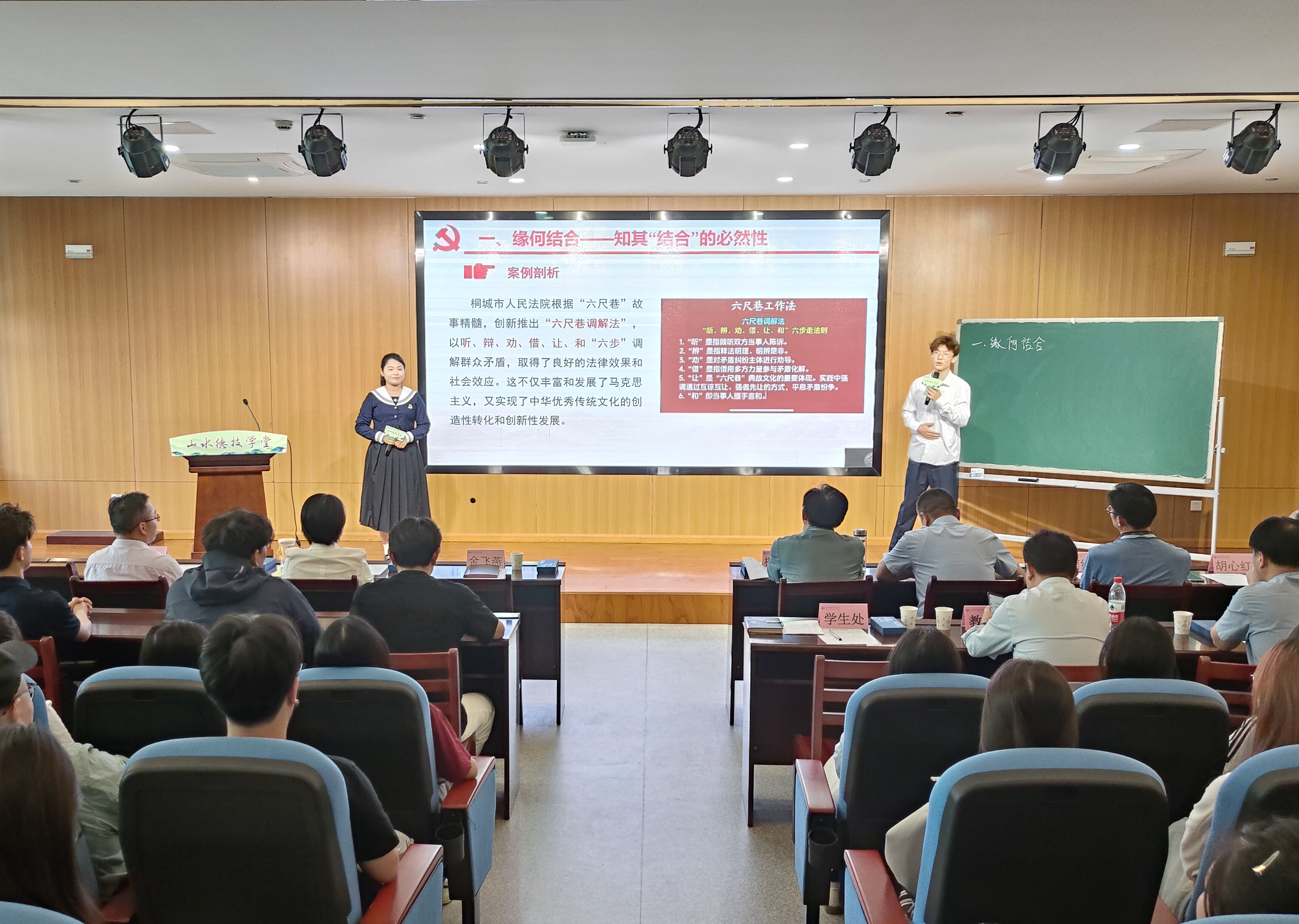 为深入贯彻落实“三全育人”综合改革,全面推进“五育并举” 教育实践,5月7日下午,我校山水德技学堂开班仪式暨首期“青言政能量”主题活动在汇心湖校区图书馆报告厅举行。活动邀请安徽省第三届大学生讲思政课比赛获奖师生代表,以青年视角展开思政教育创新研讨,探索新时代思政育人新路径。校党委副书记、校长檀明,校党委副书记金飞燕,校党委委员、副校长范家茂以及办公室、宣传部、教务处、学生处等职能部门负责人、二级学院党总支书记出席活动。
