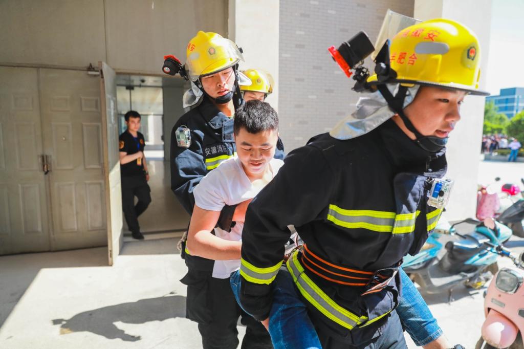 疏散完毕后,消防人员模拟了人员被困救援和现场灭火。