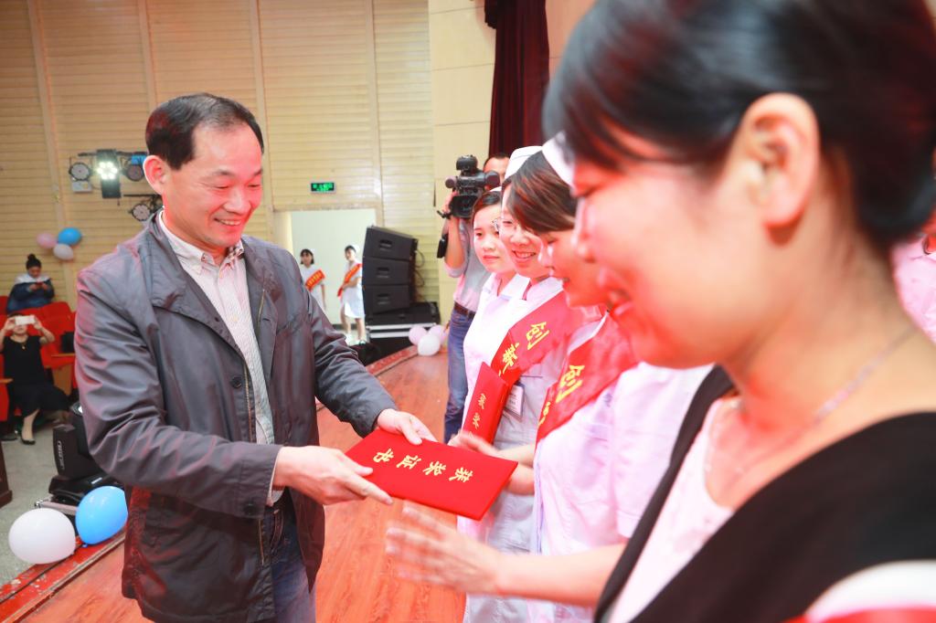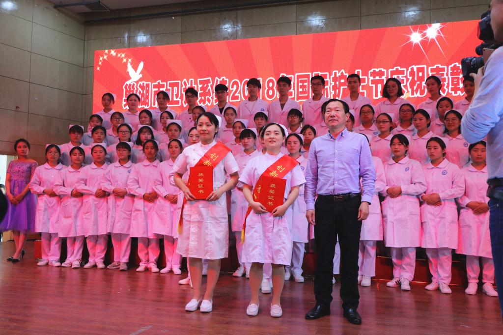 为庆祝第107个国际护士节,表彰在临床一线工作中表现优秀、爱岗敬业、奉献精神的护理人员,5月9日下午,由巢湖市卫计委主办、巢湖市护理学会和合肥888集团学院承办的巢湖市卫计系统2018年国际护士节庆祝表彰大会在我校大学生活动中心举行。全市卫计系统10余家单位及50余名白衣天使受表彰。巢湖市政府、巢湖市卫计委、巢湖市民政局、巢湖市科协、驻巢二级以上综合医疗单位负责人,各乡镇卫生院(社区卫生服务中心)主要负责人,市直医疗卫生单位主要负责人,各社会办医疗单位主要负责人以及我校师生400余人参加了本次表彰大会。校党委书记罗兆好为“创新大赛”一等奖颁奖。