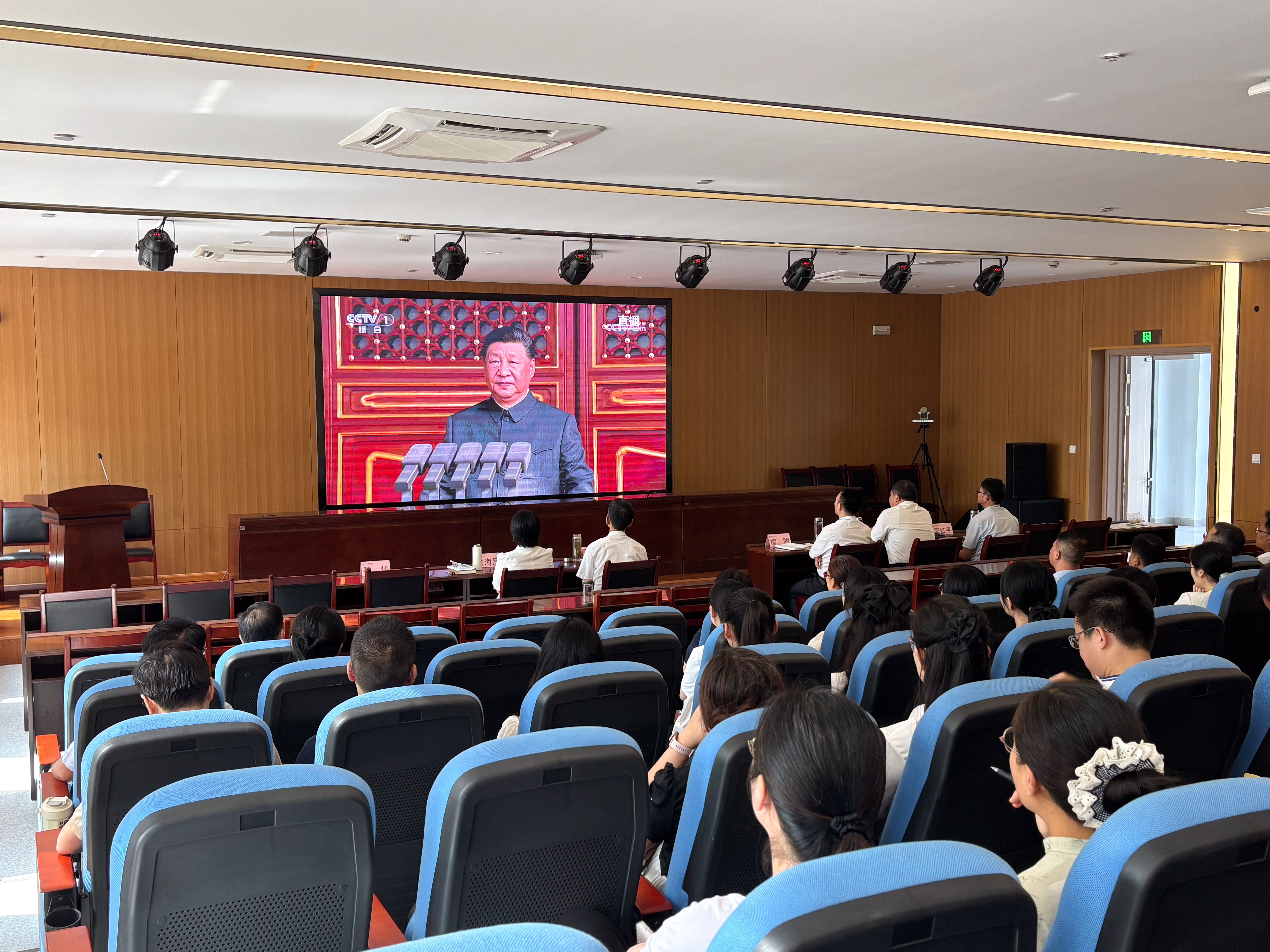 直播过程中,全体人员神情庄重、全神贯注,认真聆听习近平总书记在大会上发表的重要讲话,共同回顾中国人民抗日战争的壮阔历程,深刻感悟革命先辈为民族独立、人民解放挺身而出的崇高精神与坚定信念。