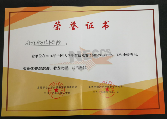 我校在2018年全国大学生英语竞赛(NECCS)中,由于组织安排得力,工作业绩突出,获得了高等学校大学外语教学指导委员会和研究会颁发的优秀组织奖。