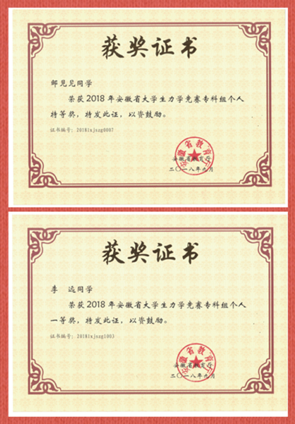 日前,2018年安徽省大学生力学竞赛总结会议在合肥工业大学屯溪路校区召开。我校建筑工程学院学子共获得6个奖次:2015级工程造价2班邹见见同学获得专科组个人特等奖,2016级建筑工程技术2班李远同学获得专科组个人一等奖,另有4名同学获得专科组个人三等奖。