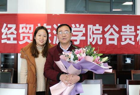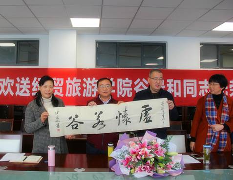 会议开始,青年教师王欢代表全体教职工向谷贵和老师献上鲜花并进行发言,真挚的话语,无言的不舍让在座的教职工心绪万分;综合办高荣明老师代表院分工会献上张俊如老师题写的赠语——虚怀若谷。上善若水,水善利万物而不争;虚怀若谷,方能容纳百川,这也是经贸旅游学院全体教职工表示的对谷贵和老师最崇高的敬意。
