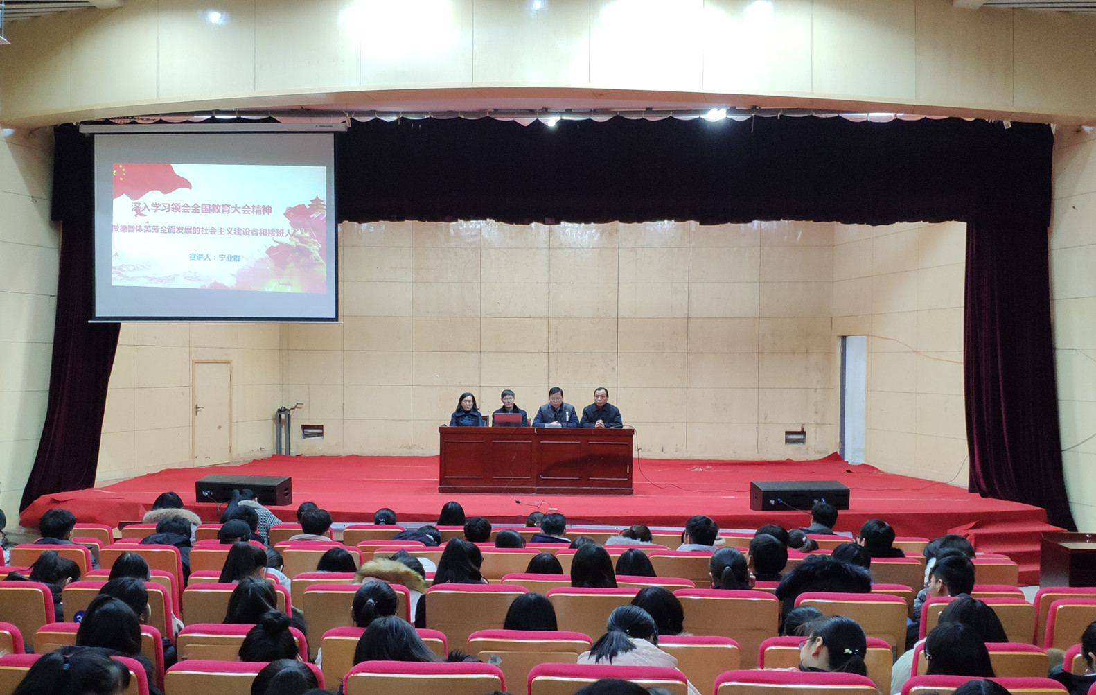 三场报告会,大学生活动中心座无虚席、气氛热烈。这次全国教育大会,是党中央在中国特色社会主义进入新时代、全面建成小康社会进入决胜阶段召开的一次历史性会议,充分体现了以习近平同志为核心的党中央对教育工作的高度重视,凸显了教育在党和国家事业中的基础性、先导性、全局性地位,在我国教育发展史上具有重要的里程碑意义。宁业群详细解读了此次全国教育大会的时机好、规格高、影响大、意义深;并从8个方面深入学习领会、全面准确把握总书记重要讲话和大会精神。