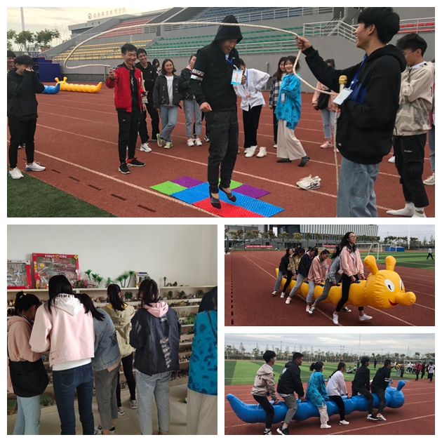 心理委员培训团体活动“自我成长”素质拓展活动由两部分组成。首先带领大家参观了两个校区的心理咨询室、团体心理活动室、心理沙盘室、心理宣泄室和音乐放松室等,让大家了解并积极向同学们宣传学校心理健康教育指导中心的服务资源。之后进行了室外心理素质拓展活动,包括齐心协力、球行千里、信任你我他、指压板跳大绳、旱地赛龙舟等,锻炼了同学们的团队协作精神,通过磨合增添默契,提高心理委员大家庭的凝聚力,在今后的工作中形成合力助人自助。