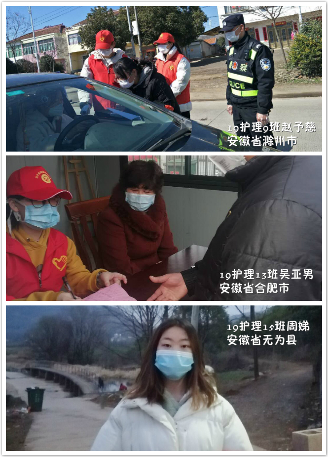 在该院一线的“最美逆行者”和前期学生志愿者的榜样精神引领下,又有一大批学生志愿者们加入抗击疫情这个队伍。他们中有在社区参加防疫工作的,比如加入社区“雷锋志愿服务团队”的赵星雨(18护理3班),还有芮梦茹(16助高班)、林怀远(18护理3班)、邵佳愉(18护理5班)、吴亚男同学(19护理13班)。在社区给过往行人测量体温、核实身份、统计社区出入人员数量、下乡宣传,口罩挡住了他们青春的面孔,却挡不住他们战胜疫情的决心和坚毅,他们在为打赢这场艰难的抗疫战积蓄力量。