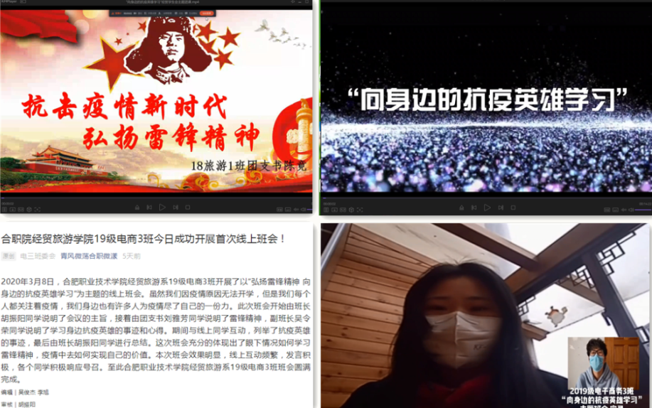 在这样一个特殊的3月,经贸旅游学院团总支号召各班级团支部通过线上方式学习雷锋精神,致敬战“疫”先锋。19电商3班班团干部组织以“弘扬雷锋精神,向身边的抗疫英雄学习”为主题的线上班会,学习雷锋精神,讨论作为一名青年学生,如何在抗“疫”时期贡献自己的力量。学院学生会学习部副部长陈竟通过钉钉软件为全体学生会成员上了一堂“抗击疫情新时代,弘扬雷锋精神”的线上团课,结合一批批请战前线的战“疫”先锋事迹和自己做志愿者的心得体会,号召全体学生干部以身作则,在战“疫”中做好先锋表率作用。