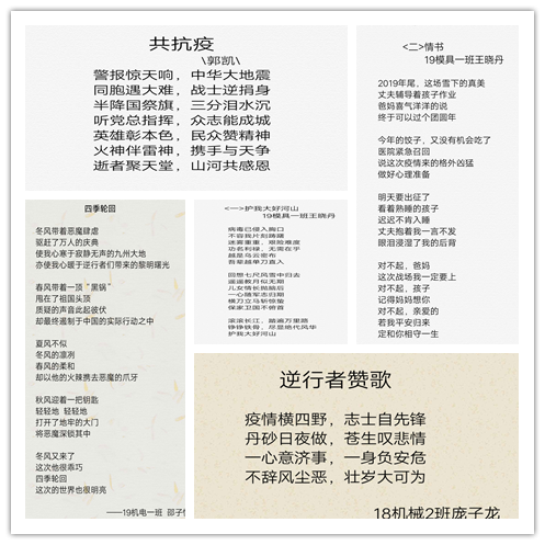 活动通知一发出就得到了同学们的积极响应,大家用文字抒发家国情怀、弘扬中国精神,用诗词歌颂为打赢疫情防控阻击战做出贡献的一线医护人员和各行业英雄,体现了全国人民众志成城、共同战“疫”的伟大时代精神。经过评委的认真评选,19机电1班郭凯荣获本次大赛一等奖,19机电1班邵子悦、19模具1班王晓丹荣获二等奖,19电机1班武文静、18机械2班庞子龙、18机械3班邵龙龙荣获三等奖。