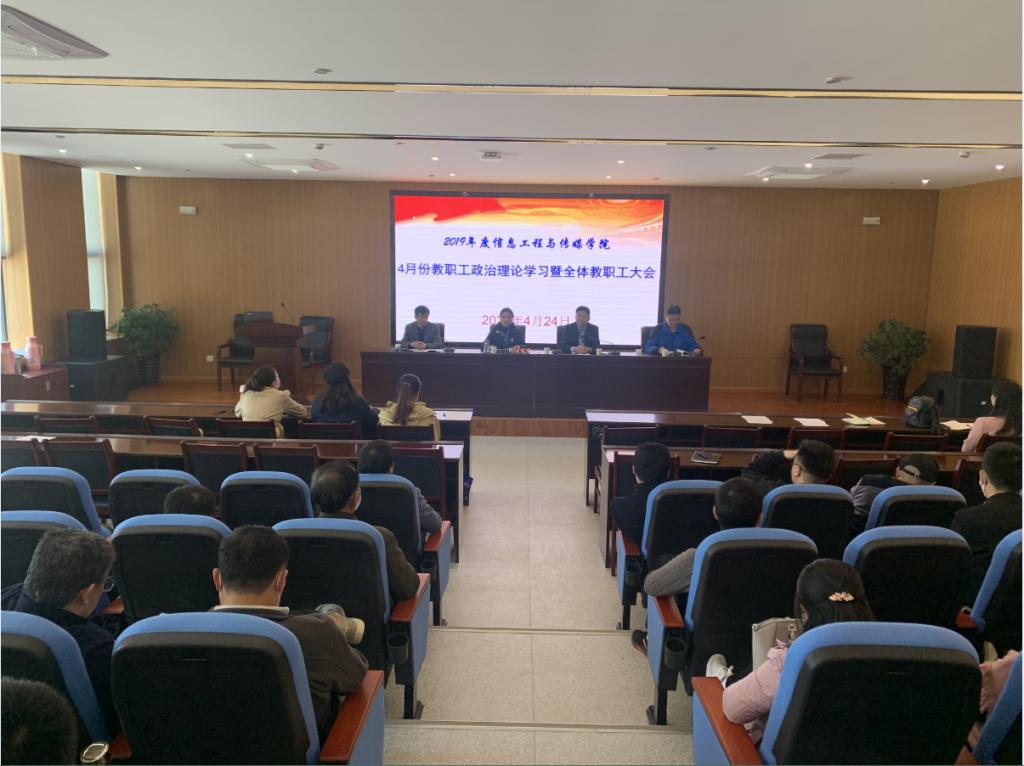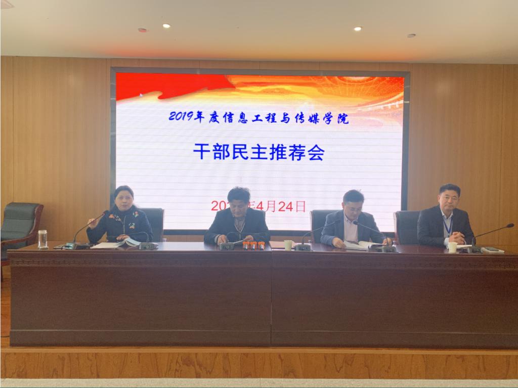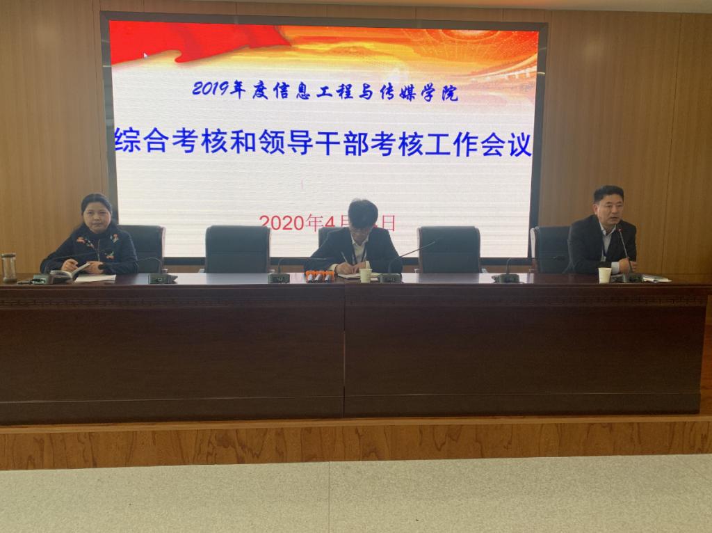 根据《合肥888集团学院2019年度二级学院 (部门)综合考核和领导干部考核实施方案》和干部推荐相关工作的统一部署,4月24日,信息工程传媒学院在图书馆报告厅召开2019年度综合考核会议暨2020年全体教职工大会,会议由该院党总支书记李红雨主持,党委综合考核组第六组组长朱道林一行出席会议,该院全体教职工参加会议。