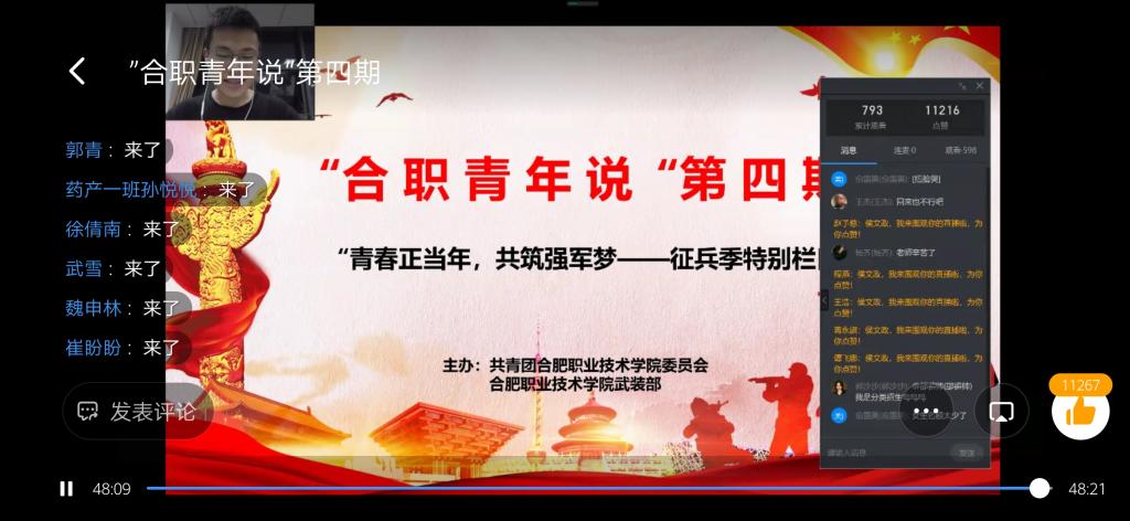 为加强征兵政策宣传,做好2020年大学生应征入伍工作,6月13日晚,我校团委、武装部通过钉钉线上直播的方式举行了“合职青年说”第四期征兵季线上特别活动,通过直播,对我校四位优秀学子进行了采访活动。在直播中,学长学姐讲述了精彩的军营故事以及携笔从戎意义。