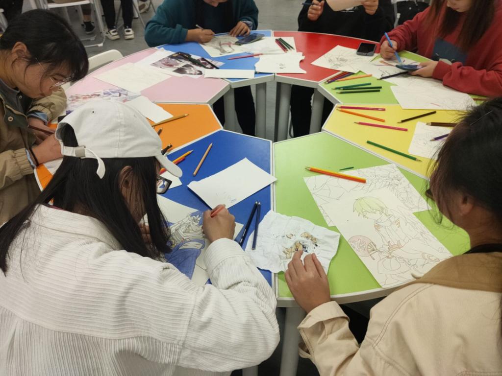活动现场,五六个同学组成一个个小组围坐在一起,桌子上摆满了画笔和纸张和动漫人物的照片,大都是同学们所熟知的动漫人物。几位同学正激情地创作,用手中的画笔在纸上刻画出一个个栩栩如生的动漫人物。
