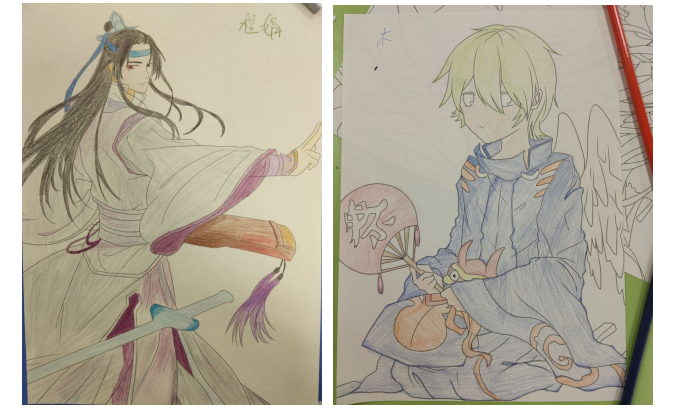 其中,程娟同学临摹的是同学们所熟知的动漫人物——蓝忘机,纸上的蓝忘机手拿古琴,英姿飒爽,与照片中的蓝忘机相差无几,色彩的搭配也相得益彰。画蓝忘机的还有一另位同学,这位同学在蓝忘机原有的动作进行了一些创意性地改变。她所画的蓝忘机手拿鲜花,深情凝望。手拿鲜花的蓝忘机,温柔无限,与动漫人物原有的形象完全不同却不让人觉得突兀。其独特新颖的创作加上优秀的绘画能力,瞬间让同学们被这幅画所吸引。