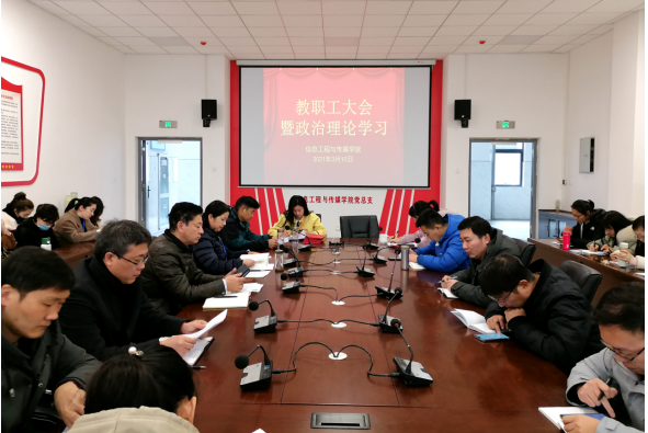 3月10日,信息工程与传媒学院在信息楼一楼会议室召开全体教职工大会,会议由院党总支书记李红雨主持,全体教职工参加会议。
