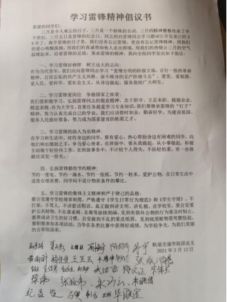 3月12日,轨道交通学院车辆专业学生组织同学制定学习雷锋精神倡议书,并宣读签字。倡议全体同学从身边的小事做起,深入学习雷锋精神,积极开展学雷锋活动,努力成为雷锋精神的传承者。