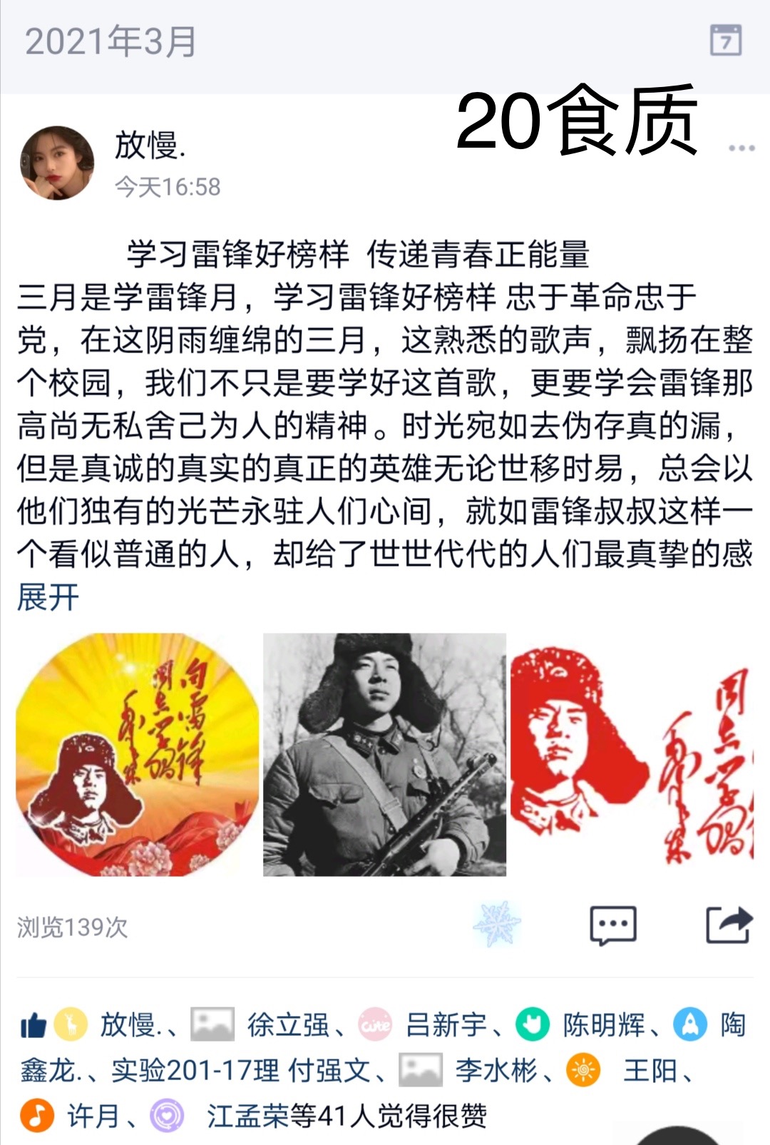 此次主题团日同学们参与的积极性非常高,也通过活动深刻体会到雷锋精神的含义所在。雷锋同志爱岗敬业,学而不厌,锲而不舍的精神值得我们学习,他心里永远装着别人的精神也在激励着我们一代又一代青少年的成长。我们当代大学生应和榜样雷锋一样,有一分热,发一分光,如萤火一般,永远做一颗为祖国事业奉献的螺丝钉。(供稿:生物工程学院 编辑:杨璨)