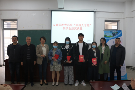 为推动人才培养改革,充分发挥校企双方优势,深入开展校企合作,促进共同发展,定向培养企业所需的高素质专门人才,生物工程学院与知名企业安徽国胜大药房连锁有限公司于2019年合作首届“国胜卓越班”,实施“工学结合,学训互动,实习就业一体化”办学模式,实现学生从在校学习到实习就业一体化的订单培养模式。4月14日,在生化楼A305,安徽国胜大药房连锁有限公司人事总监樊晓蓉、人事副总监陈玉玲,学院党总支书记汪春荣、副院长(主持工作)刘修树、副院长方丽波及订单班主要负责人共同进行“国胜卓越班”奖学金颁奖等活动。