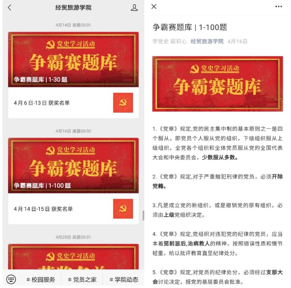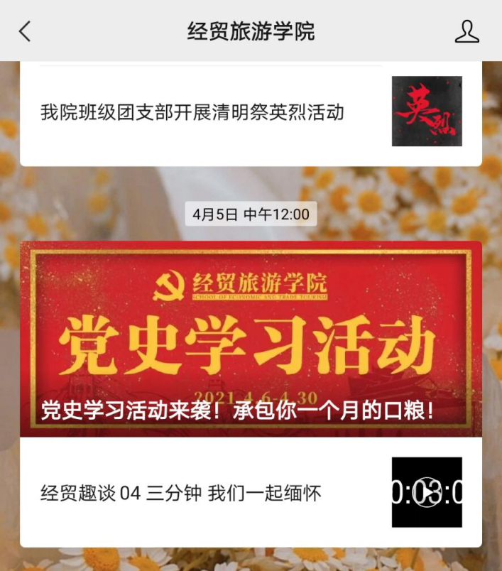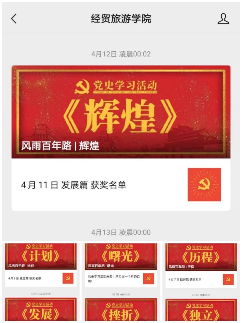 微信公众号是经贸旅游学院的特色板块。通过微信公众号开展党史学习教育,创新了师生学习党史的活动形式,提高了师生参与学习教育活动的热情和积极性。(供稿:经贸旅游学院 编辑:杨璨)