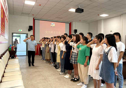 按照议程,预备党员对一年来的工作、学习和生活情况进行汇报,并宣读转正申请。随后入党介绍人说明了各位预备党员考察期间情况并进行表态。接下来,参会的正式党员进行讨论、无记名投票,支部书记江寅昌同志宣布表决结果,大会同意张英等28名预备党员同志按期转正。随后,江寅昌同志带领28名学生党员重温入党誓词。