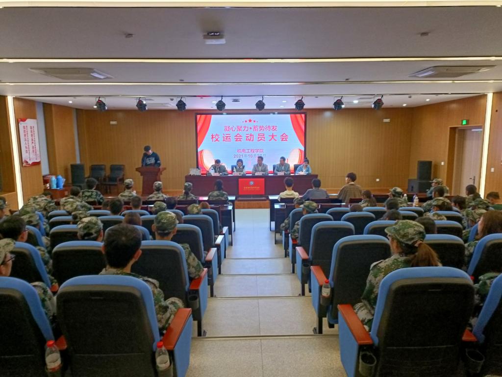 金秋十月,硕果累累。迎着秋日的阳光,伴随着收获的季节,我们将迎来一年一度的学校第九届田径运动会。为了动员全院上下各方面的力量,保证迎接校运动会工作圆满成功,机电工程学院于10月27日下午在图书馆一楼学术报告厅召开运动会动员大会。机电工程学院党总支副书记(主持工作)王克勇、院党总支副书记丁迎春、院学管办主任杨晨、辅导员张开老师以及全体运动员参加大会,大会由院团总支书记朱何萍主持。