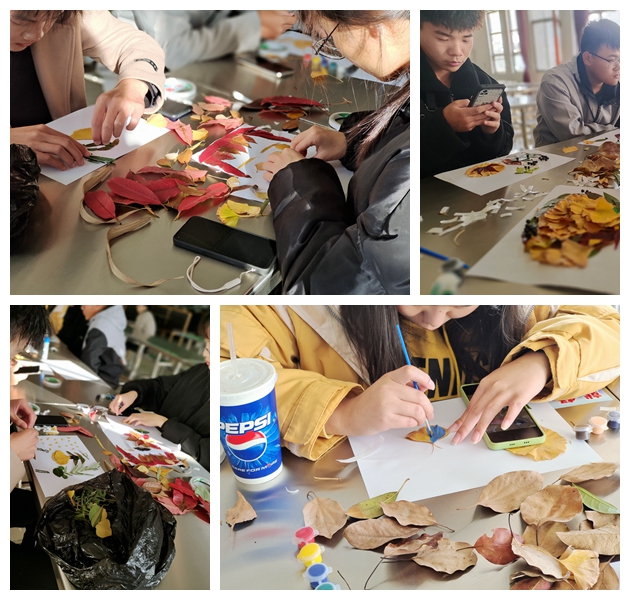 活动中,同学们用心认真地在空白纸上粘贴树叶,发挥想象力并搭配其他元素制作出一幅幅不一样的作品。平凡的落叶经过加工之后变得美轮美奂,赋予了每片叶子灵魂。“早秋惊落叶,飘零似客心。”凋零的落叶是一种残缺的美,却也是大自然的馈赠。同学们将自己心中的想法用树叶表达出来,呈现出一幅幅美丽的画卷,这也体现了本次活动的意义,感受身边的一切美好,发现生活中的小确幸。
