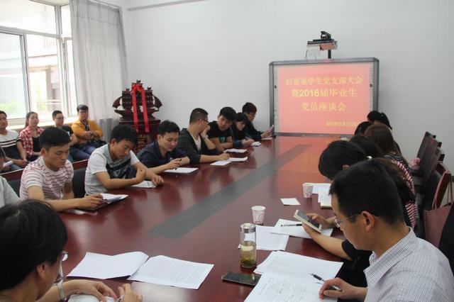 2016年5月29日下午,经贸系在系会议室召开学生党支部大会暨毕业生党员座谈会,讨论潘晨曦等47名同学转正事宜。学院副院长周晓隆应邀出席,经贸系学生支部全体成员及经贸系2016届全体学生党员参加了大会。