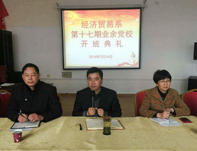 3月24日下午,经贸系第十七期业余党校开班典礼在经贸楼五楼会议室举行。学院党委副书记胡其云应邀出席,经贸系党总支、学生支部全体成员及本期培训班57名学员参加了开班典礼。开班典礼由经贸系党总支副书记吴俊峰主持。