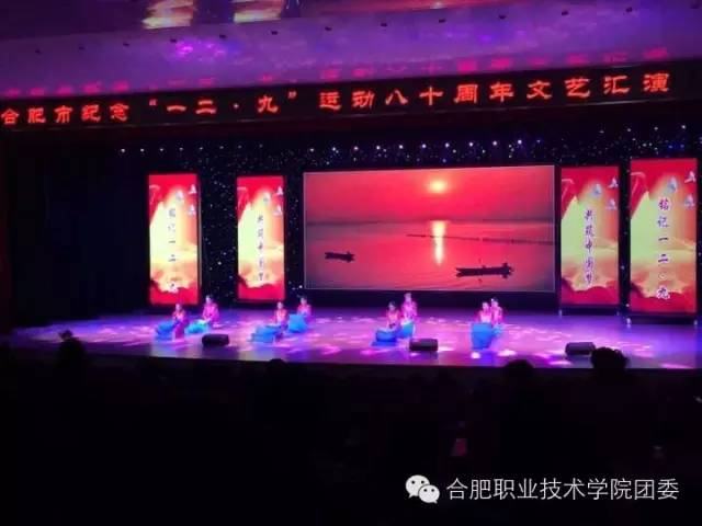为纪念“一二·九”学生爱国运动八十周年,进一步深入学习贯彻党的十八大、十八届三中、四中、五中全会和习近平总书记系列重要讲话精神。用社会主义核心价值观引领全市团员青年,深思历史大势,前瞻祖国未来,展示我市大学生的良好精神风貌,丰富校园文化生活。2015年12月6日下午,由共青团合肥市委员会、合肥市学生联合会联合举办的“铭记一二·九共筑中国梦”合肥市纪念“一二·九”运动八十周年文艺汇演在合肥幼儿师范高等专科学校大礼堂隆重举行,院团委、社团管理委员会负责人出席了本次活动,院艺术团8名学生参加了此次活动。