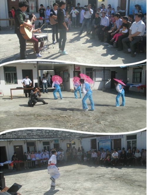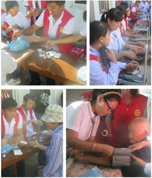 由医学相关类专业的志愿者们组成的义诊队为村里的老人们测量血压、血糖,检测血型,并为他们制作了健康档案,同时向他们宣传老年人保健知识。