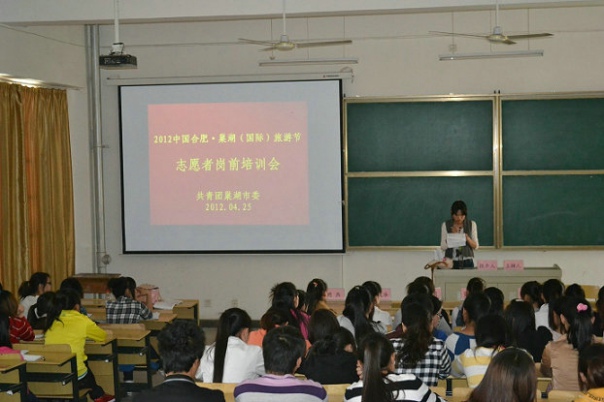 4月25日下午,我院100位青年志愿者参加了在教学楼A幢阶梯教室举办的中国合肥•巢湖(国际)旅游节志愿者岗前培训会。