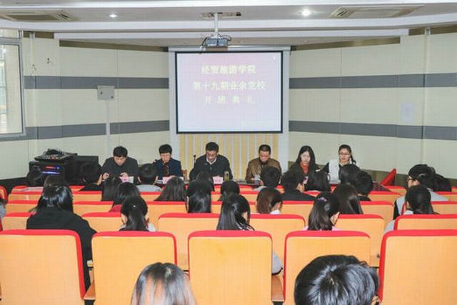 根据经贸旅游学院党总支计划安排,11月22日下午,经贸旅游学院在学院图书馆一楼报告厅隆重举行第十九期业余党校开班典礼。学院党委委员、副校长孙兴林应邀出席,经贸旅游学院党总支委员、学生党支部全体党员及第十九期业余党校全体学员参加了开班典礼。