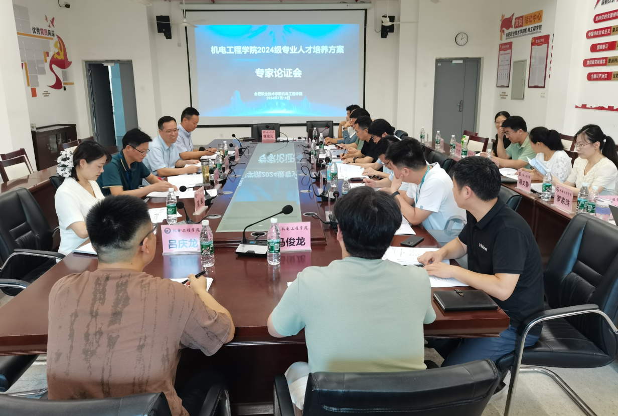 为高质量完成机电工程学院专业人才培养方案的修(制)订工作,7月18日,机电工程学院在机电楼二楼会议室召开了机械设计与制造、机电一体化等6个专业人培方案2024修(制)订版的专家论证会。会议邀请高职院校专家代表、合作企业专家代表,毕业生代表和校内专家共同参与论证。学校教务处处长窦红平教授、机电工程学院党政负责人、各专业带头人参加此次论证会,会议由机电工程学院院长胡木林主持。
