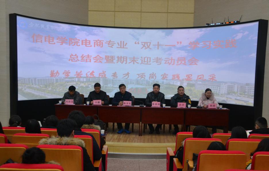 2018年元月4日下午,信电学院在图书馆二楼报告厅隆重举行电商专业“双十一”学习实践总结会暨期末迎考动员会,二级学院党政负责人及16、17级全体电子商务专业学生参加了此次活动,会议由电子商务教研室主任韩路主持。