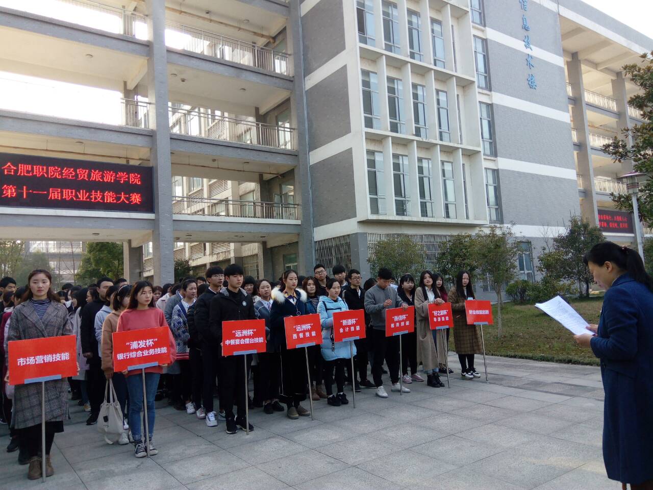 上午8时30分,经贸楼前人头攒动,气氛热烈,掌声不断。经贸旅游学院正在这里举行隆重而热烈的竞赛开幕式。学校副校长孙兴林、工会主席张广龙、教务处处长宋风长以及相关的行业企业专家代表等应邀参加了开幕式。学院院长赵红在开幕式上做了热情洋溢、振奋人心的讲话。她指出通过本次比赛营造起勤练技能、学好技能的良好氛围,一方面可以更好地“以赛促学”,给同学们创造一个切磋技艺、展示水平的舞台;另一方面可以“以赛促教”,促进学院贯彻落实高级技能人才的培养工作,“切实加强技能教学、全面提高教学质量”,检验学院教学工作的质量和前期教学改革工作的成效。